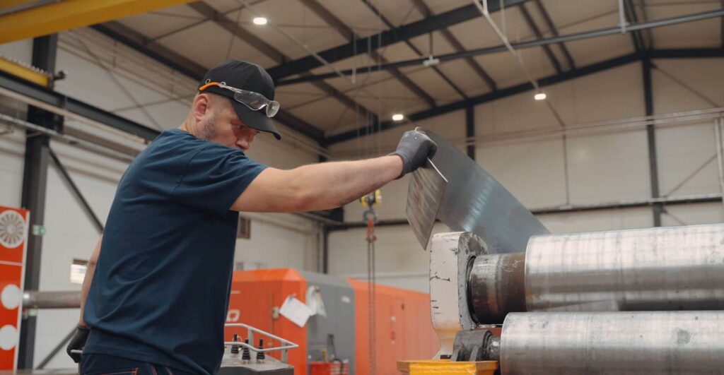W przypadku elementów o zmiennej geometrii realizujemy walcowanie stożków, natomiast dla elementów wymagających szczególnej precyzji lub nietypowej geometrii stosujemy gięcie krokowe, umożliwiające stopniowe formowanie blachy zgodnie z założeniami projektowymi. Technologia ta znajduje zastosowanie m.in. przy elementach o dużych promieniach, segmentach obudów, osłonach oraz detalach specjalnych.
